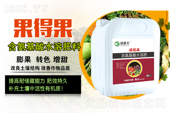 新密市沃蓓豐生物科技有限公司【含氨基酸水溶肥料-果得果】游離氨基酸含量達100g/L,微量元素硼、鐵、錳、鋅含量達20g/L,富含有機質(zhì)可迅速提高地溫,補充土壤中活性有機質(zhì);罨寥乐锌衫玫酿B(yǎng)分粒子,緩解過量施肥造成的土壤鹽害,改良土壤結(jié)構(gòu),改善作物品質(zhì),提早上市延長作物采收期,提高作物的耐儲藏能力,肥效,后勁十足,在低溫條件下,膨果效果顯著。