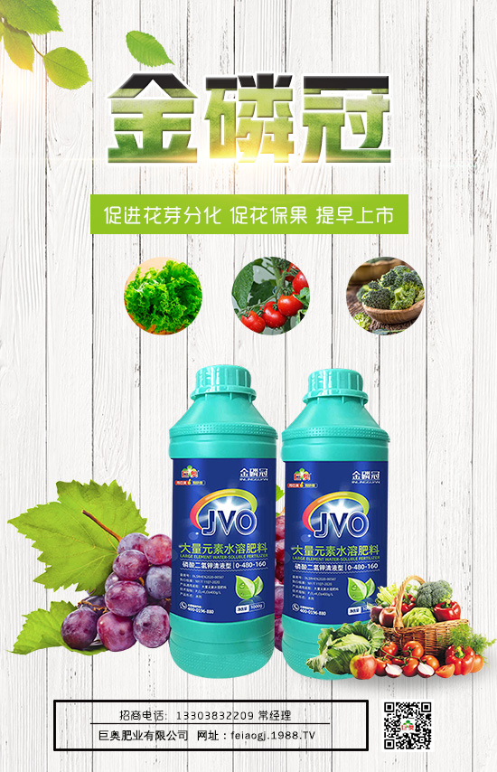 巨奧肥業(yè)有限公司【大量元素水溶肥料0-480-160-金磷冠】有效促進光合作用和增加樹體的養(yǎng)分積累,促進葡萄花芽分化,提高葡萄開花座果,提早上市,提高經濟效益。
