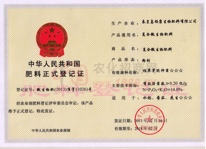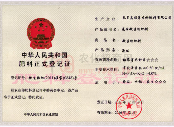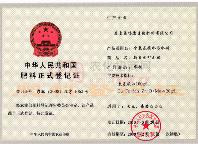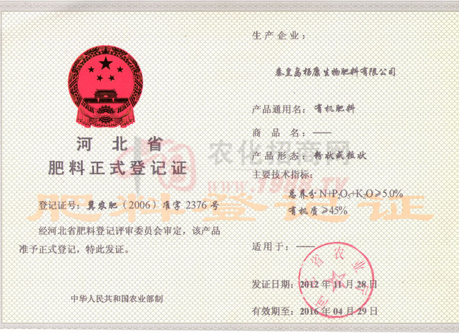 2000年以來(lái)公司始終被中國(guó)綠色食品發(fā)展中心認(rèn)定為推薦產(chǎn)品,并獲得AA級(jí)生產(chǎn)資料的榮譽(yù),2003年被河北省土肥站認(rèn)定為重點(diǎn)推廣品,2006年被北京路橋認(rèn)證中心認(rèn)證為有機(jī)產(chǎn)品生產(chǎn)資料,從1998年以來(lái),由技術(shù)質(zhì)量監(jiān)督部門(mén)的抽查均“合格”,未發(fā)生客戶投訴的事件。